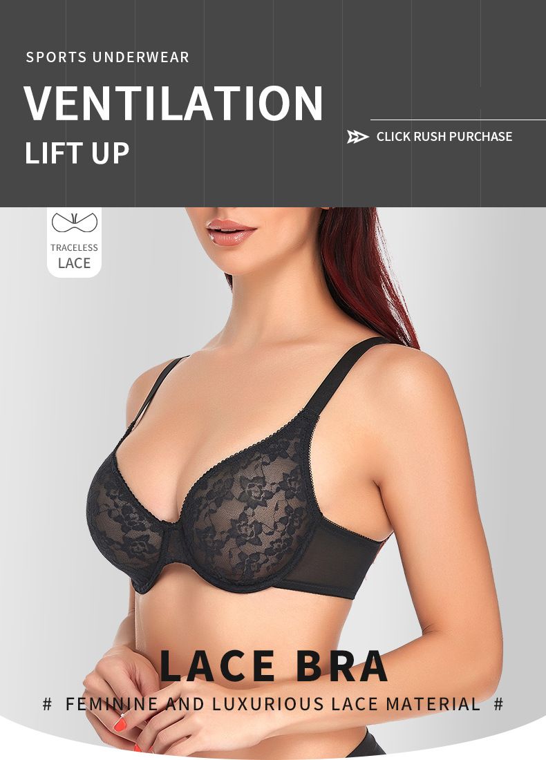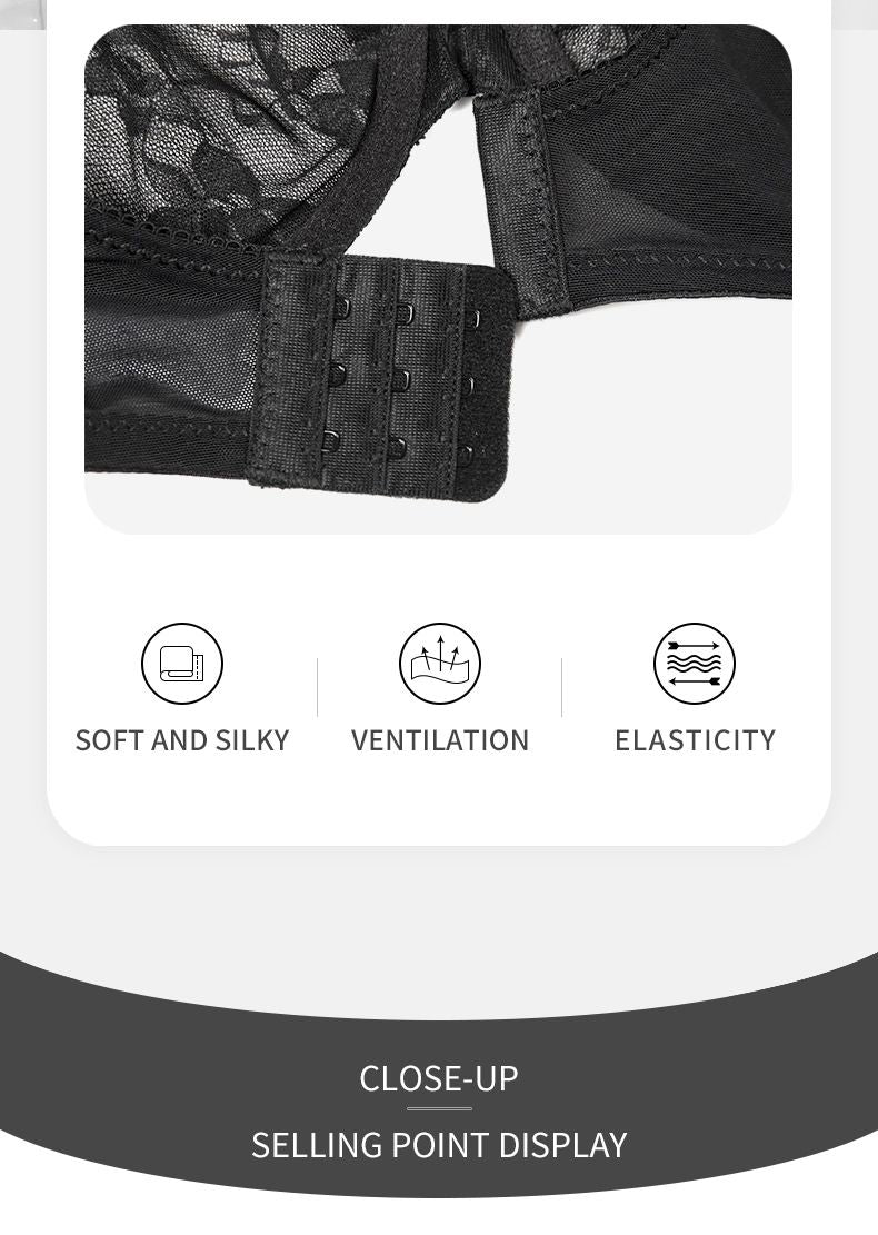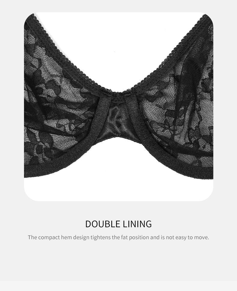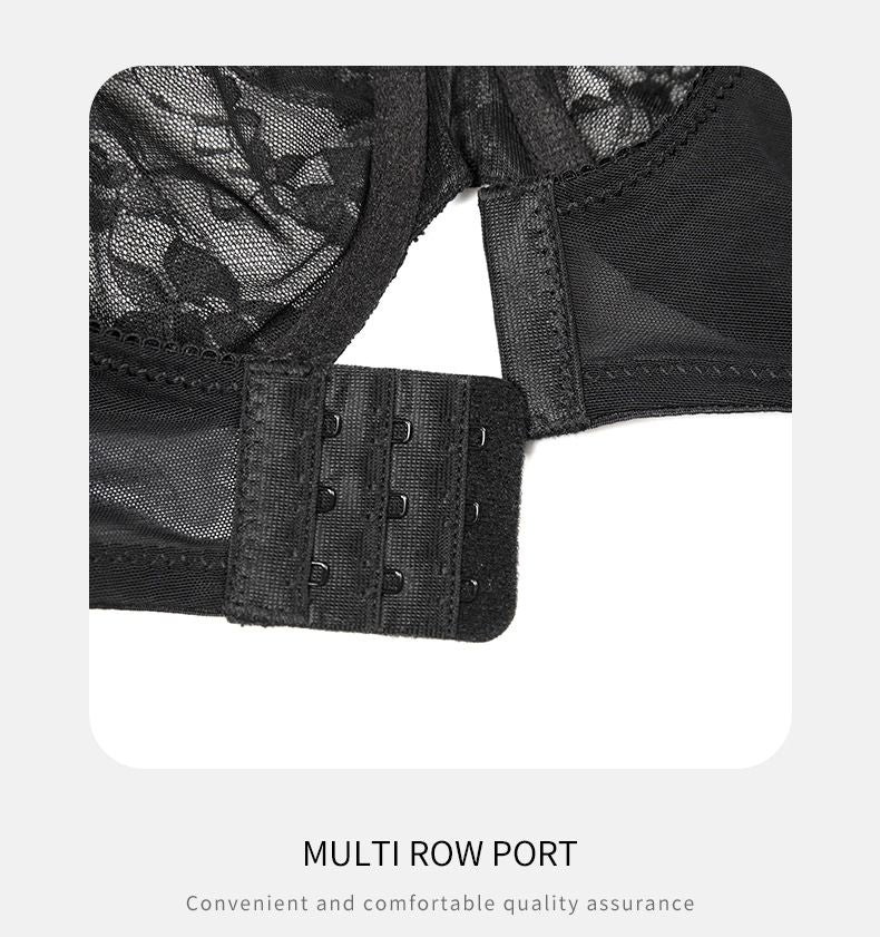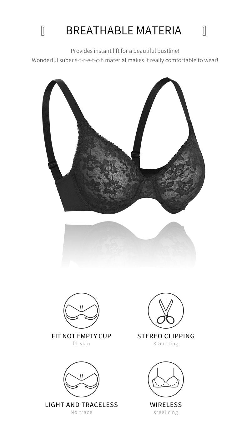 Comfort Breathable Anti-Sagging Push Up Ultra Thin Underwired Black Plus Size Lace Bra